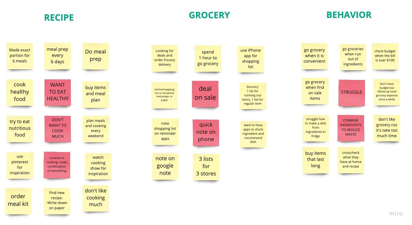 I noticed some patterns keep repeating. So I grouped it into 3 categories: Recipe, Grocery, and Behavior. I used Affinity Mapping to find the key findings of my research.