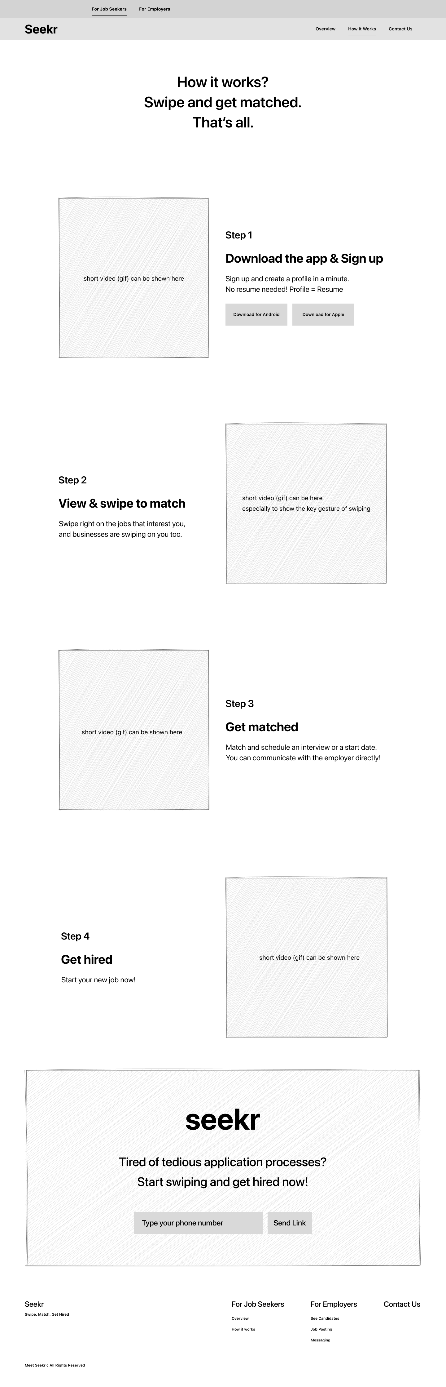 On the 'how it works' page, we showed every step to use the Seekr application with photos. We highlight the key feature of the application "Swipe and get matched".