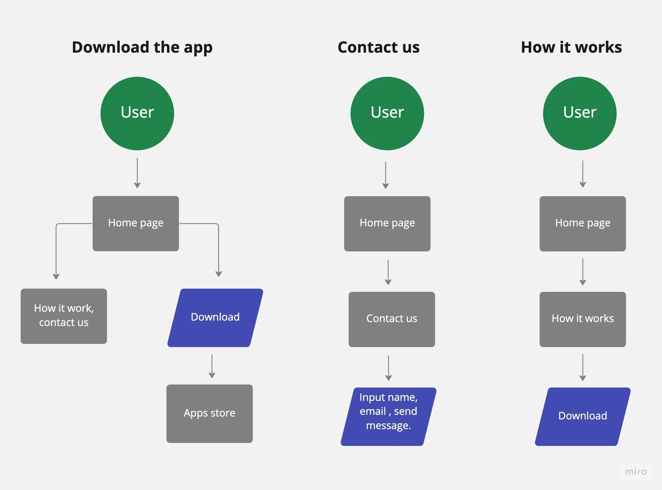We created user flows to understand user experience better when they go to our website. We divided three main flows for user. We intended to ask user to download this application.